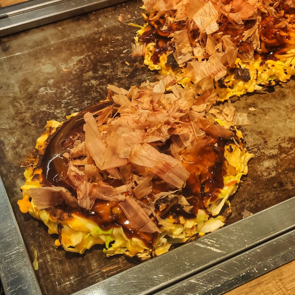 A volte invece vi portano l’okonomiyaki già fatto (lo fanno in cucina e poi ve lo mettono sulla piastra solo per tenerlo caldo) e dovete solo condirlo: sopra infatti ci vanno maionese e salsa okonomiyaki, opzionalmente anche katsuobushi (tonnetto essiccato e sfogliato) e aonori (alga in pezzetti piccolissimi, tipo spezia per capirci). Il katsuobushi, essendo supersottile, col calore si muove dando l’illusione che sia vivo.