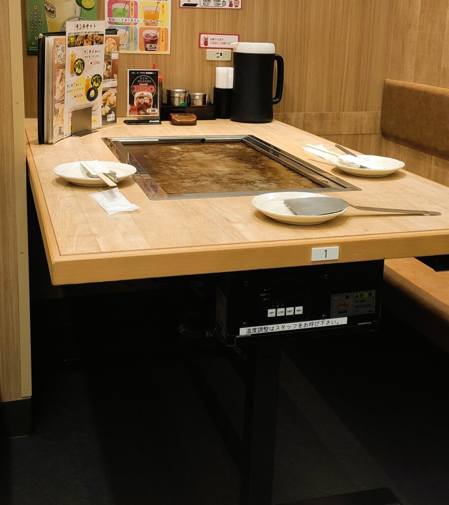 I ristoranti specializzati in okonomiyaki hanno i tavoli con una piastra in mezzo chiamata teppan.